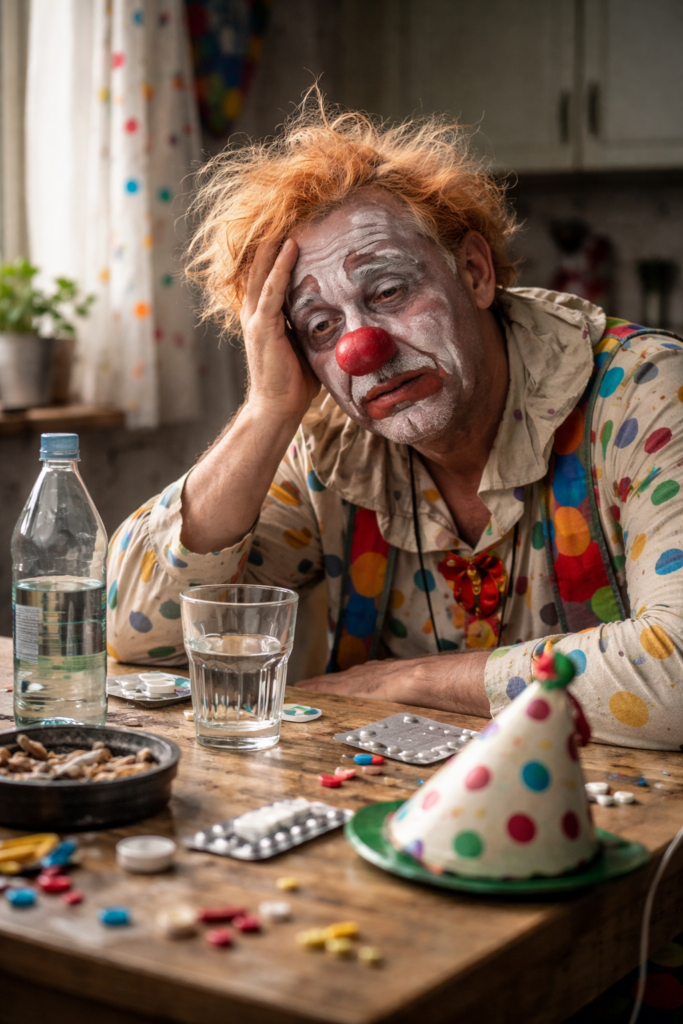 Draußen ist alles still. Kein Konfetti. Kein Lachen. Nur ein Clown, der weiß: Auch ein Narr hat einen Morgen danach.