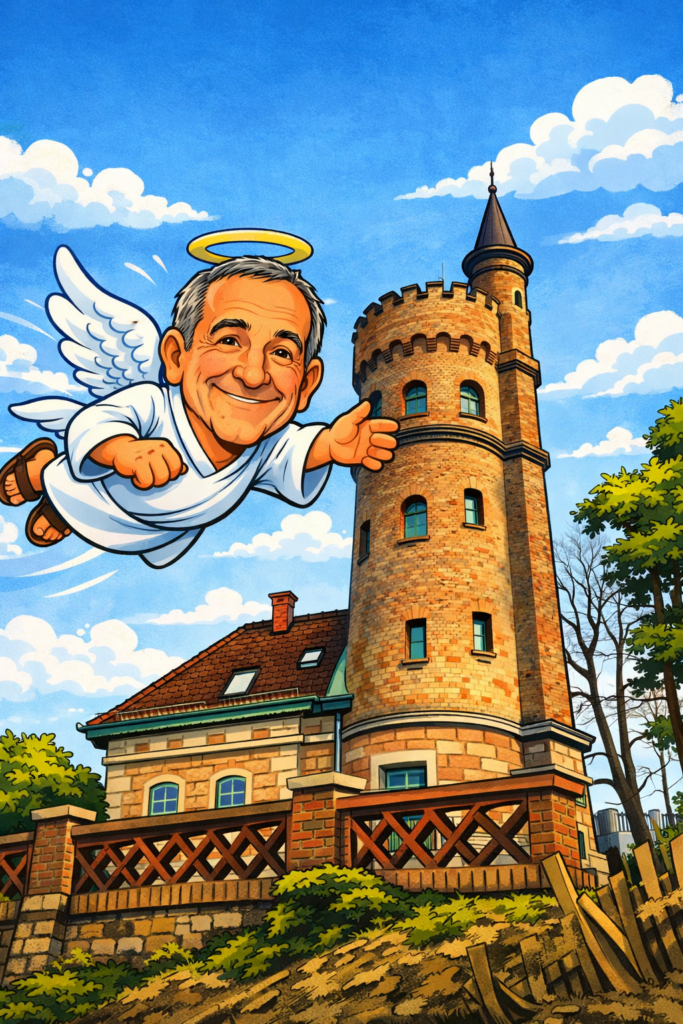 Der Himmel war heute ungewöhnlich klar, fast so, als hätte jemand extra für mich aufgeräumt. Also breitete ich die Flügel aus, setzte den Heiligenschein fest – na gut, halbwegs fest – und nahm Kurs auf die Marienwarte am Reinberg. Schon von oben wirkte sie stolz und ruhig zugleich, so wie Bauwerke, die wissen, dass sie bleiben dürfen.